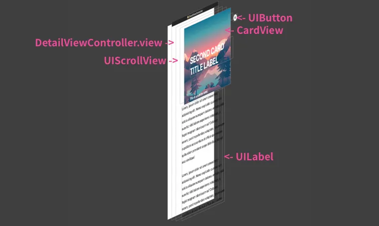 DetailViewControllerのviewの上にはUIScrollView、UIScrollViewの上部には今回独自で実装するCardViewと閉じる用のUIButton、そしてCardViewの下側には、UILabelという構成になっています。