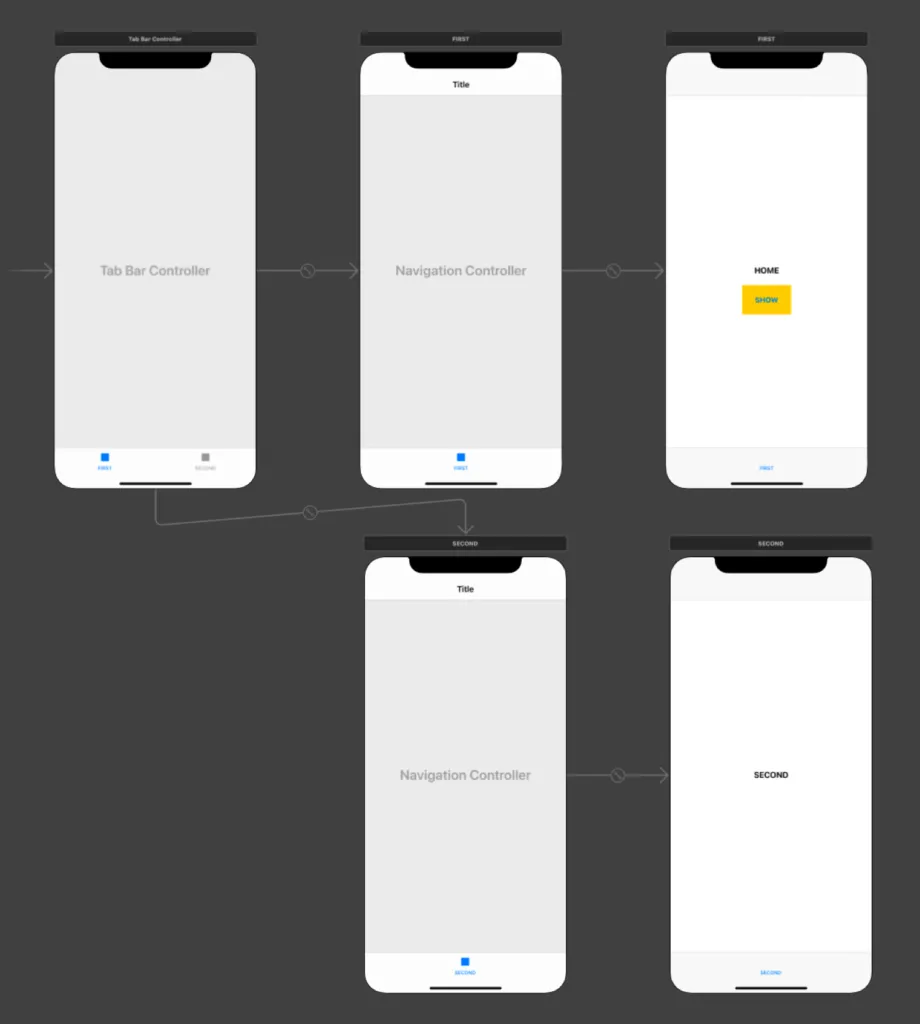 まずは、UITabBarControllerを実装して、UIVIewControllerを2つ紐付けます。